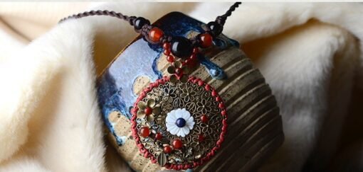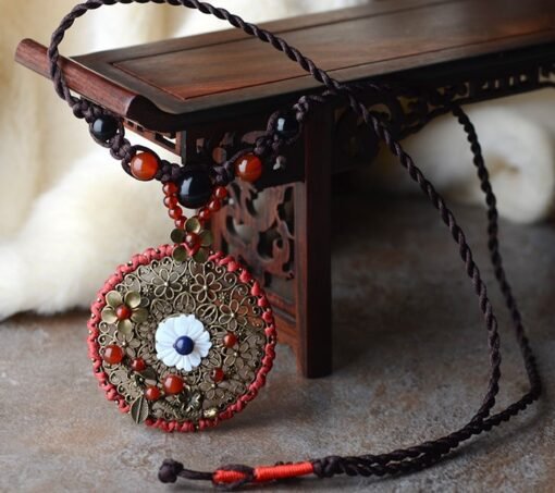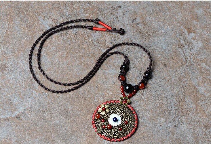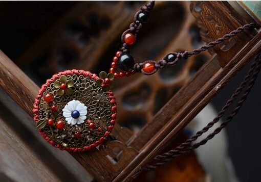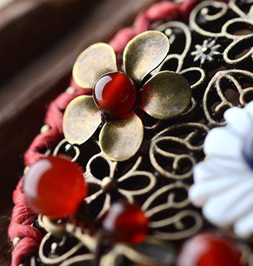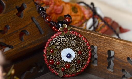Jewellery can be used to tell stories, and this Crimson Gold Flower Necklace necklace is telling its own. The Crimson Gold Flower Necklace is charming, with black threads tied together to make a long chain and vivid red beads surrounding a gold thronged flower pattern, the big white and gold flowers on top of the gold mesh contrasting but complimenting it beautifully.