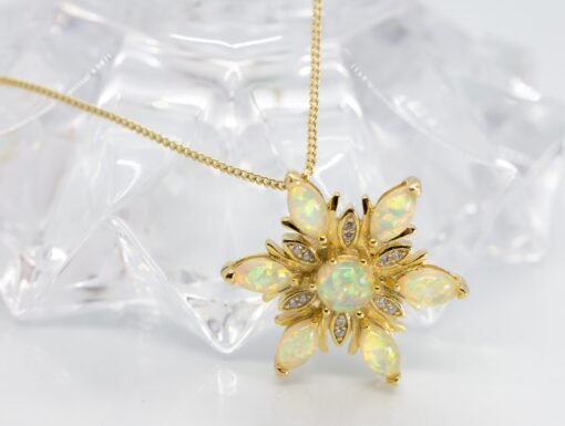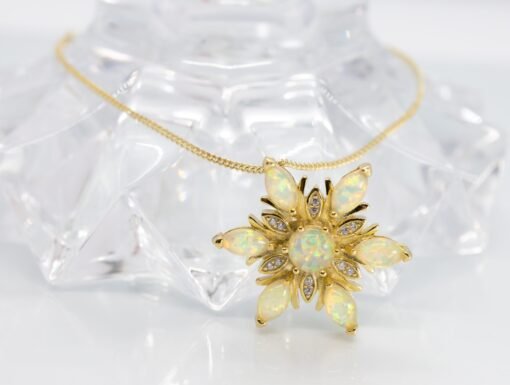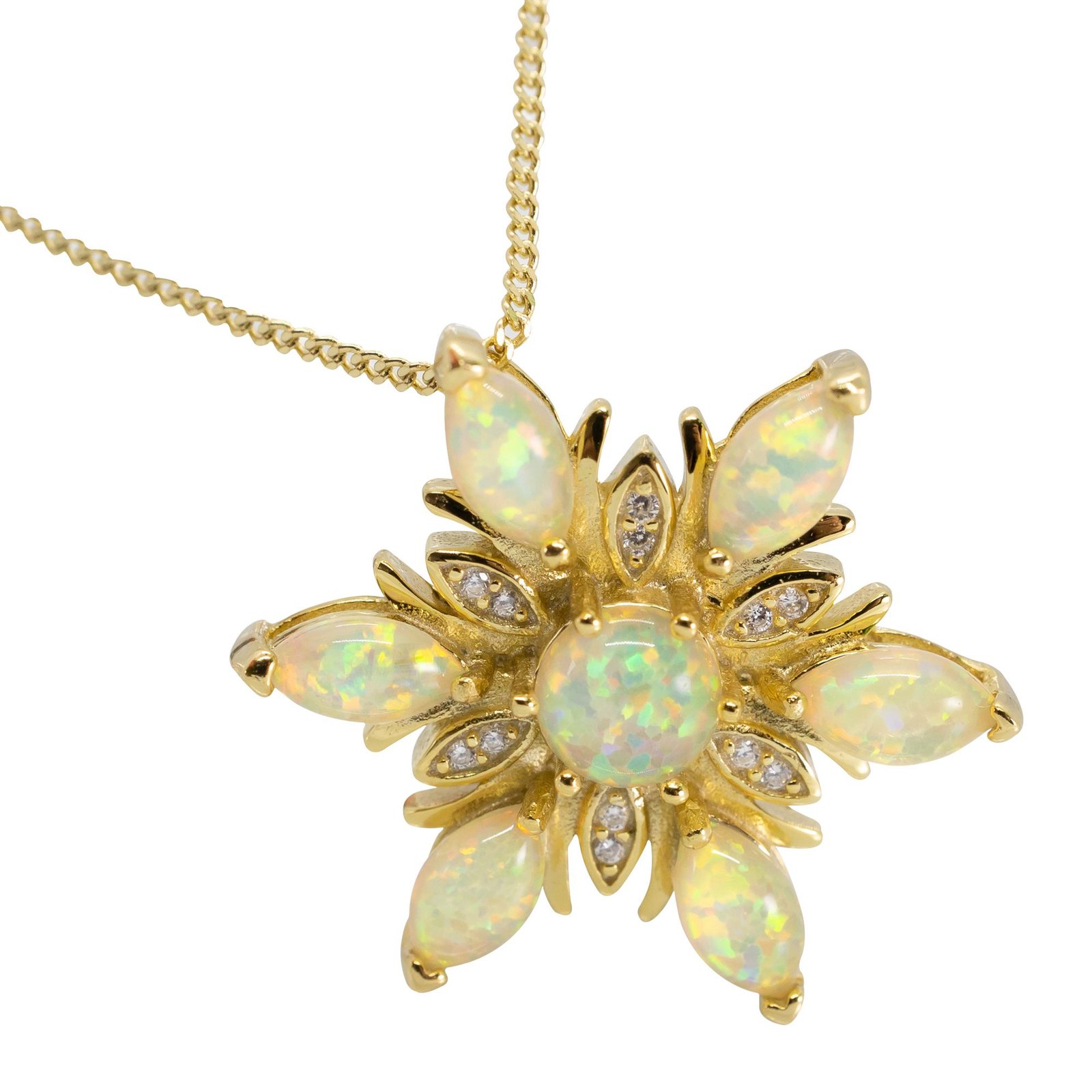 This Snowflake Gold Necklace takes into account the most popular materials in the fashion industry and gives you the 14k Yellow Gold plated necklace embedded with yellow fire Opal Stone. This spectacular shade of gold makes for a whimsical look, especially when you add in the reflecting Opal Stone that is complimented by the tiny Cz embedded alongside the opals.