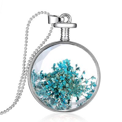 Turquoise daisies are arranged delicately in between sheets of oval crystal glass that shine and glimmer as the charm swings from the necklace. The charm is reinforced by silver plating that strengthens and adds a stylistic sense of beauty.